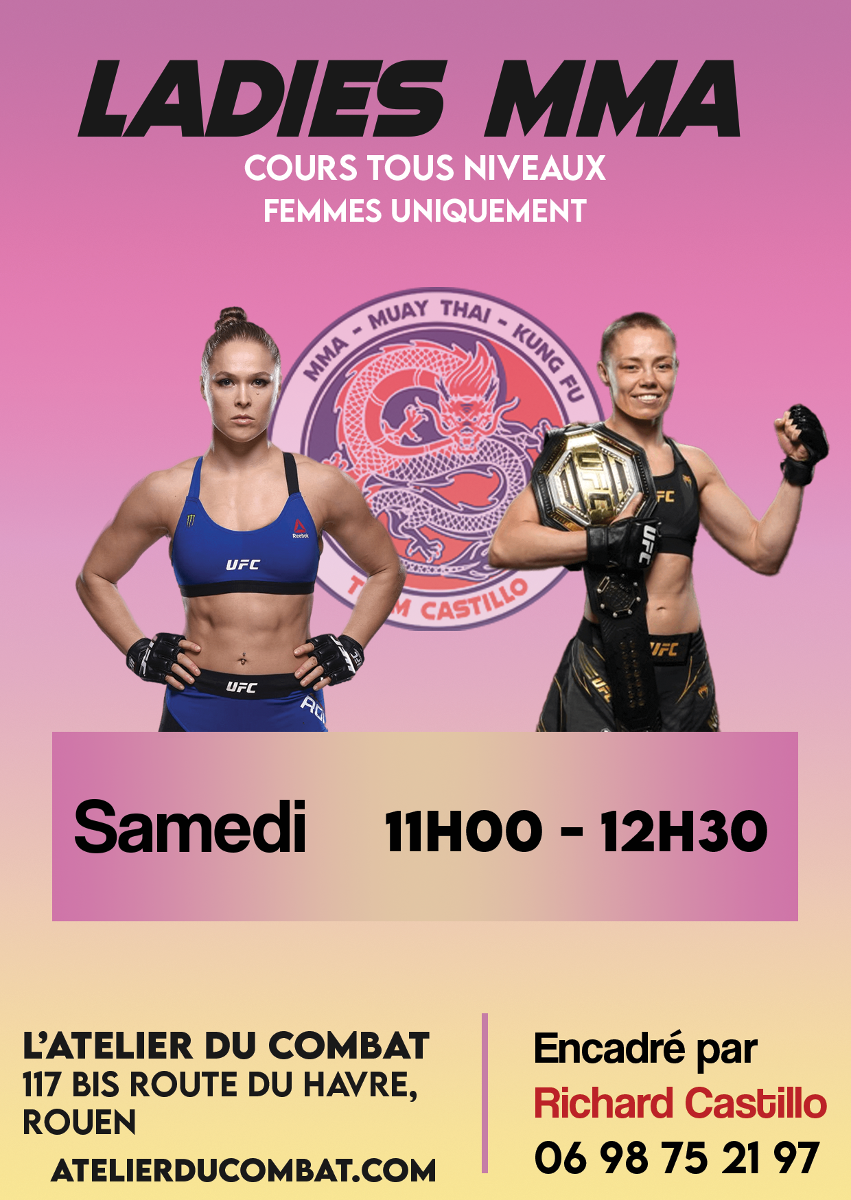 Découvrez nos cours exclusifs de Ladies MMA à l’Atelier Du Combat, idéalement situé à Rouen. Désormais proposés les mercredis et samedis, ces séances réservées aux femmes sont l’occasion parfaite pour plonger dans le monde du MMA, développer votre force, votre confiance en vous et votre forme physique, le tout dans une atmosphère inclusive et stimulante. Rejoignez-nous pour une expérience unique de combat et de développement personnel, conçue spécialement pour vous.