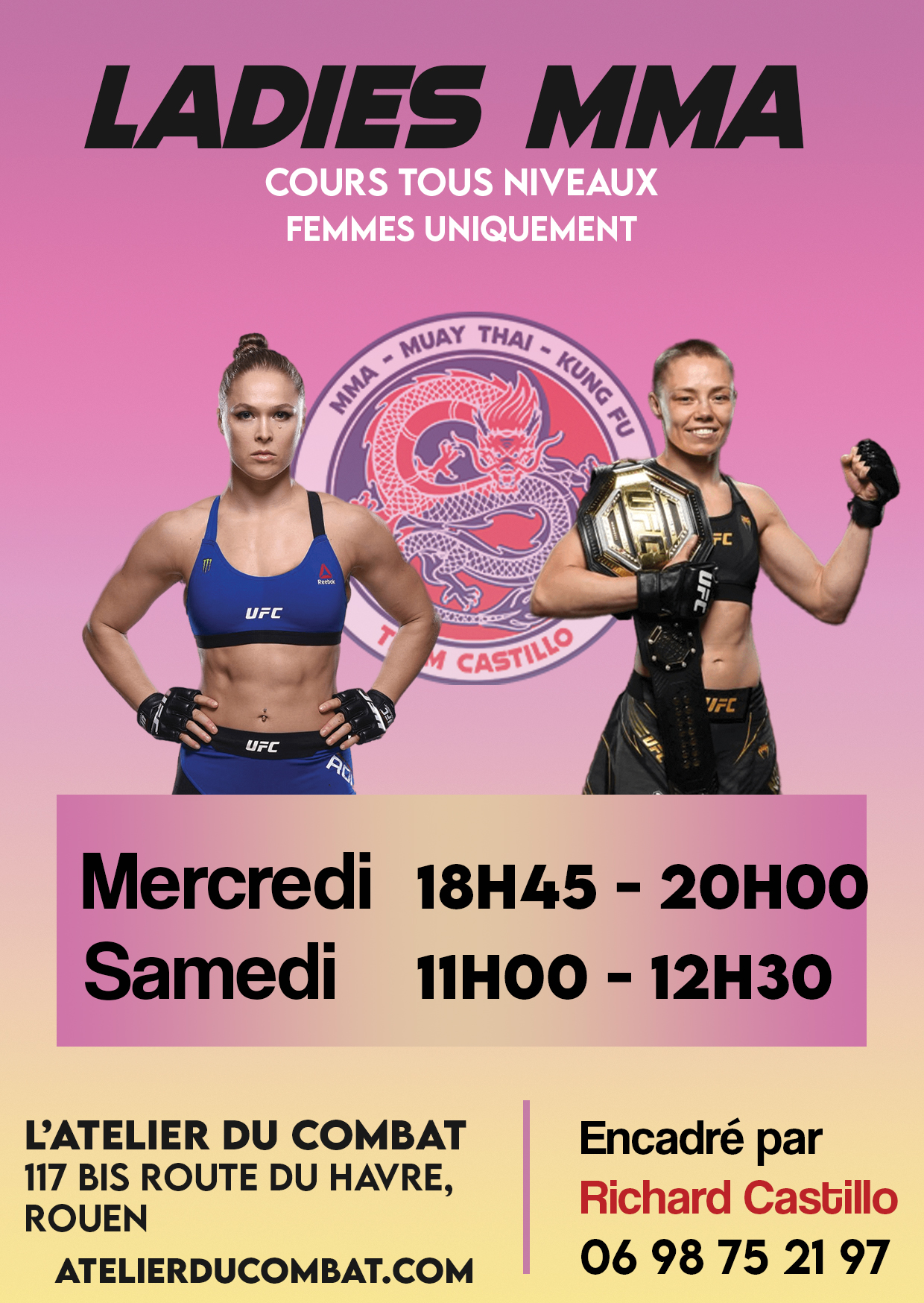 Découvrez nos cours exclusifs de Ladies MMA à l’Atelier Du Combat, idéalement situé à Rouen. Désormais proposés les mercredis et samedis, ces séances réservées aux femmes sont l’occasion parfaite pour plonger dans le monde du MMA, développer votre force, votre confiance en vous et votre forme physique, le tout dans une atmosphère inclusive et stimulante. Rejoignez-nous pour une expérience unique de combat et de développement personnel, conçue spécialement pour vous.