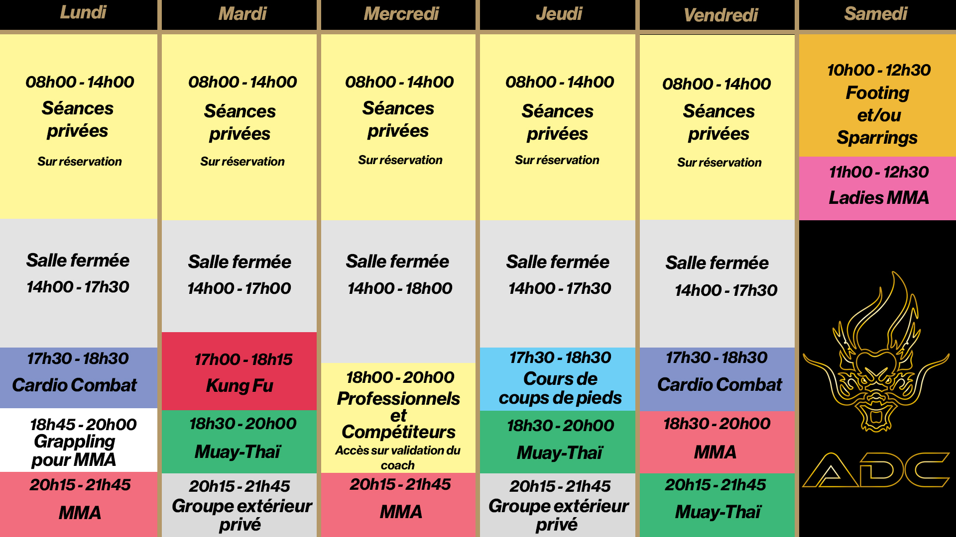 Choisissez les créneaux qui vous conviennent et rejoignez-nous pour des entraînements adaptés à tous les niveaux. Notre planning est conçu pour offrir une flexibilité maximale à nos membres, que vous soyez débutant ou avancé.